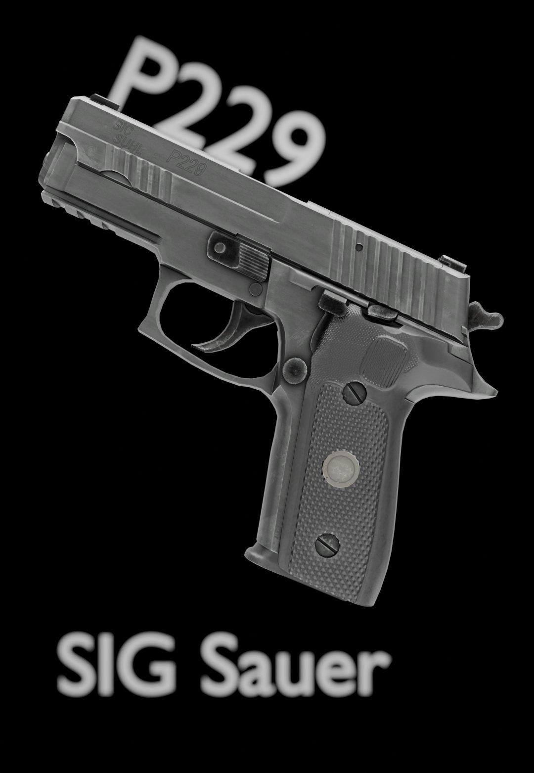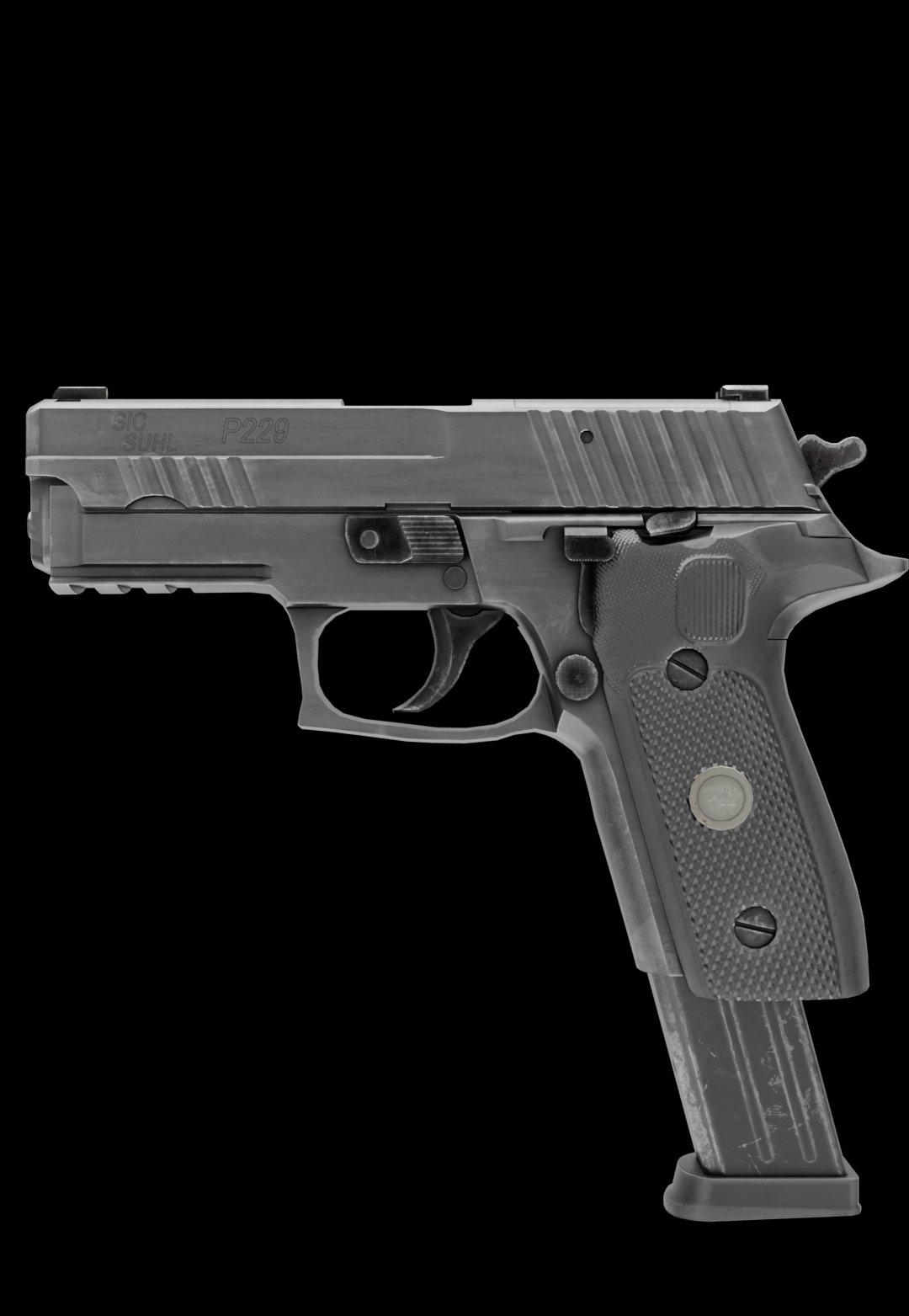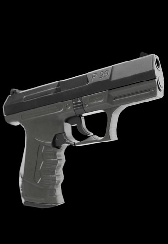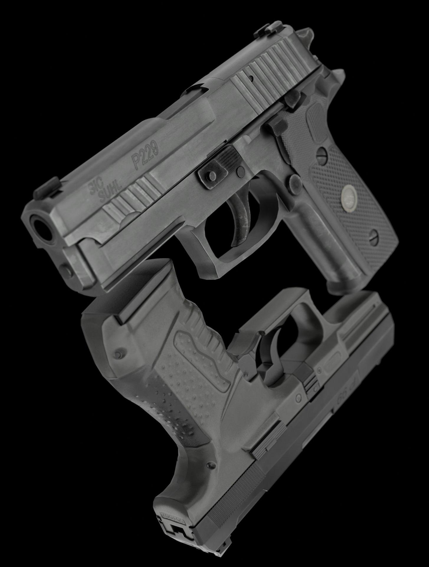 This set contains two 3D weapon models: the SIG Sauer P229 and the Walther P99. The SIG Sauer P229 has 11,261 vertices and 19,686 faces. The Walther P99 has 7,636 vertices and 10,185 faces. Each model features a rig and a detachable magazine. The render was done in Cycles. Formats: FBX, OBJ, blend.